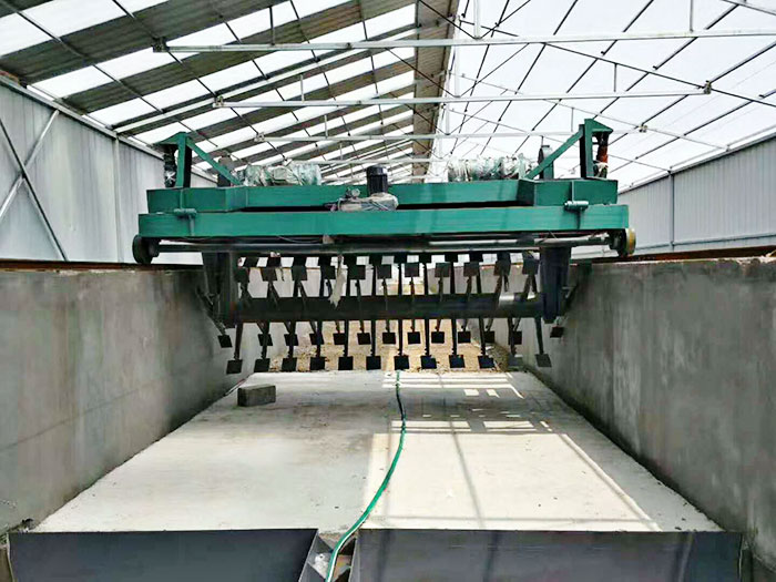③優(yōu)缺點(diǎn):行走式翻堆機(jī)采用翻拋齒旋轉(zhuǎn)的翻堆結(jié)構(gòu)與自動行走系統(tǒng),翻堆時可根據(jù)料堆的深度進(jìn)行升降,因此翻堆徹底,效率高,翻堆和輸送同時完成,機(jī)器邊行走邊翻堆自動完成全部工作過程,實(shí)現(xiàn)流水式有機(jī)肥生產(chǎn)。翻堆期間可以使用行走式翻動翻堆機(jī),受天氣影響小、占地面積小、周期短、節(jié)省人力,一機(jī)多槽使用,處理能力強(qiáng),操作簡單自動化生產(chǎn),設(shè)備投資成本也相對較低。缺點(diǎn)是攪拌機(jī)與堆料接觸部分高速旋轉(zhuǎn)易磨損,且與糞便混合物直接接觸容易被腐蝕,需要進(jìn)行維護(hù)和更換。