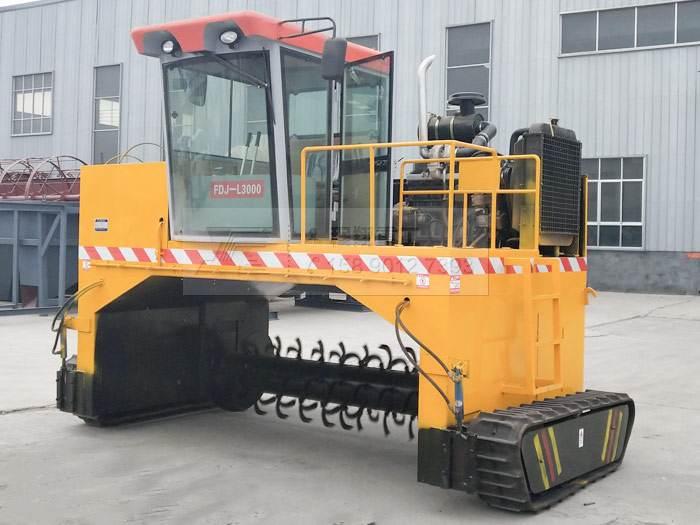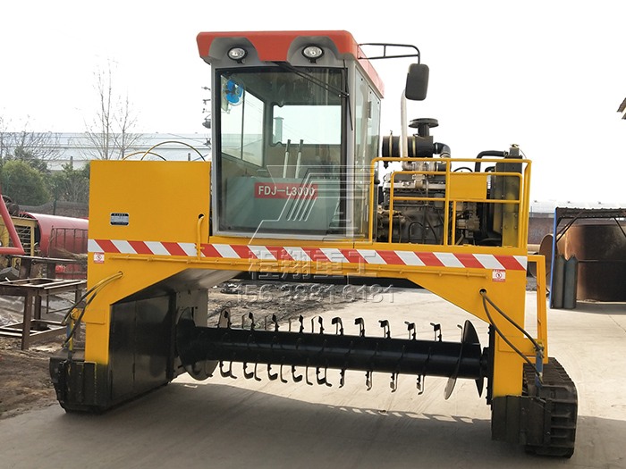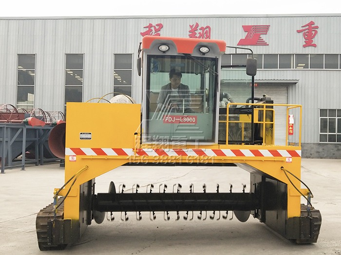 2.行駛中整車騎跨在預(yù)先堆置的長(zhǎng)條形堆體上,由機(jī)架下掛裝的旋轉(zhuǎn)刀軸對(duì)堆體原料實(shí)施翻拌、蓬松、移堆,車過(guò)之后篡成新的條形垛堆。